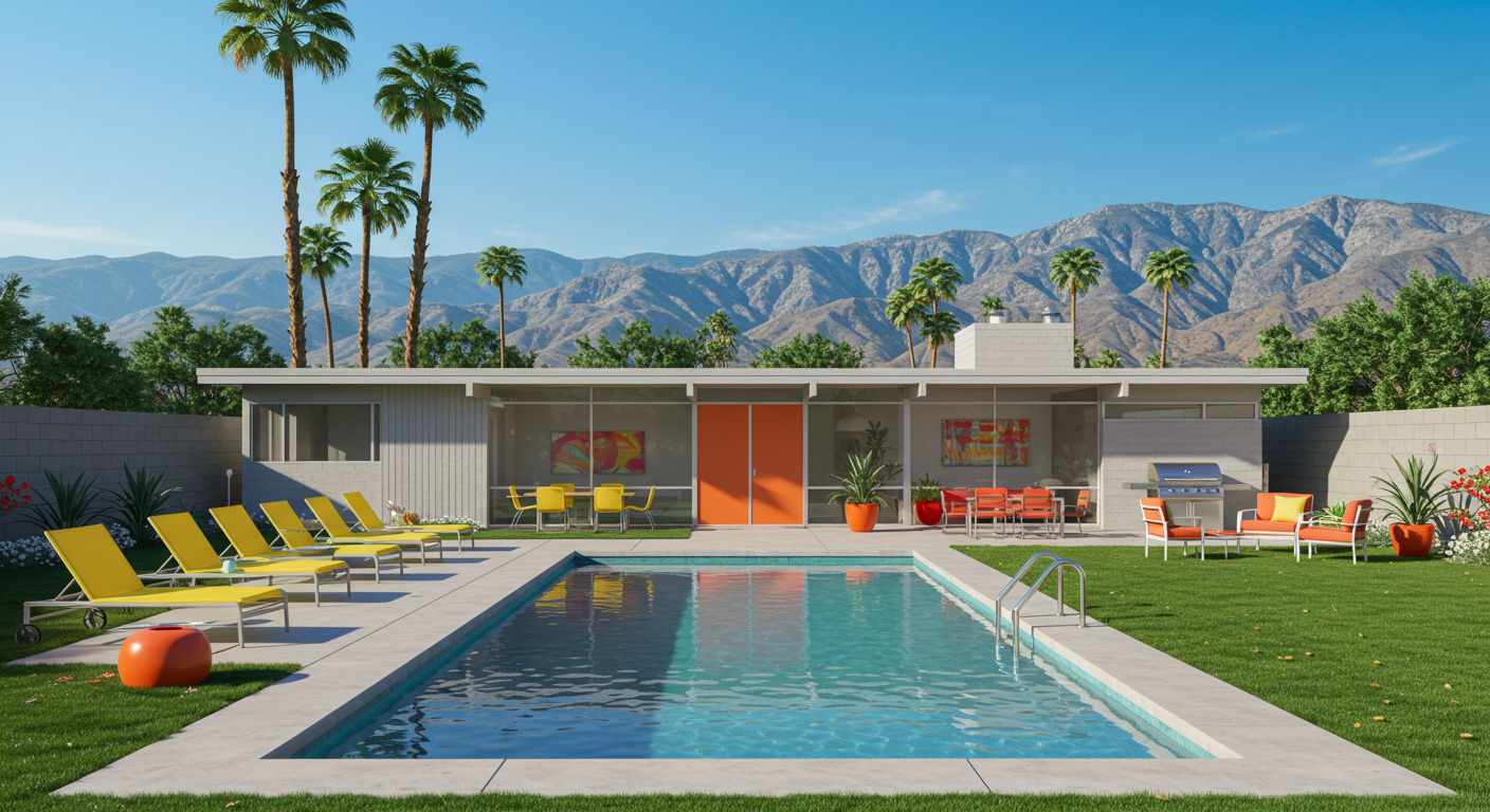 The mid-century modern home look is sleek, angular, and distinctive, with large open garages, flat or sloped roofs, and splashes of color for added interest. Palm Springs mid-century modern homes, in particular, offer deep sparkling pools, spacious pergolas, tennis courts, and beautiful patios.