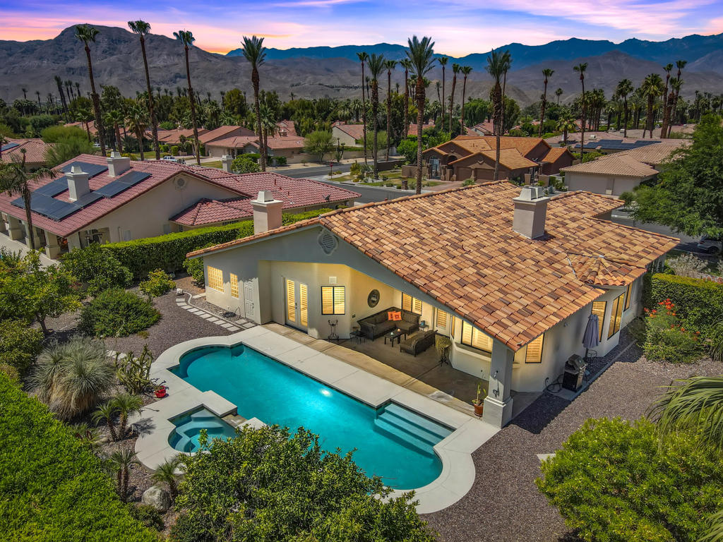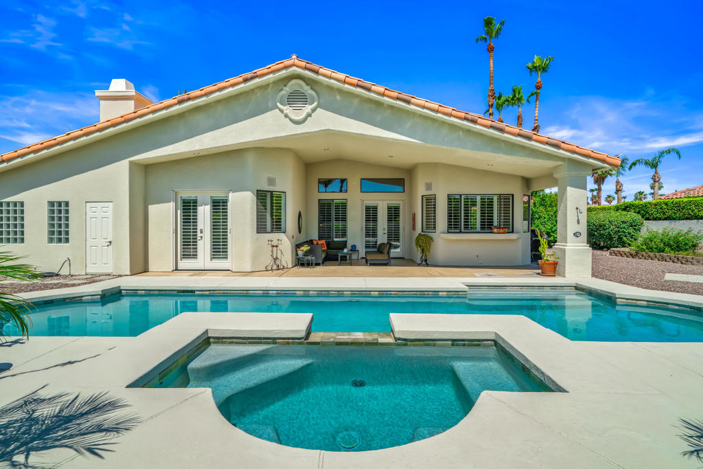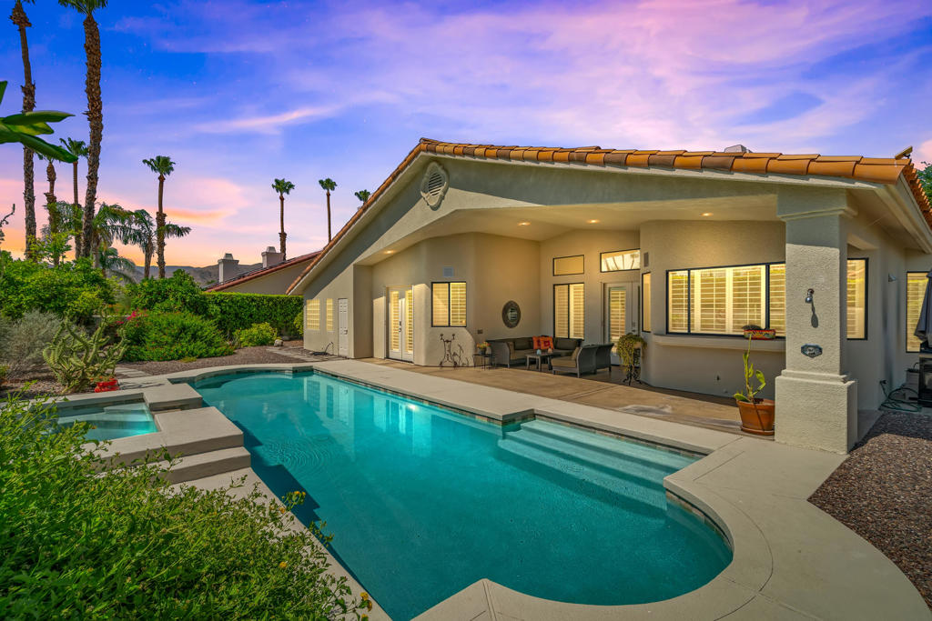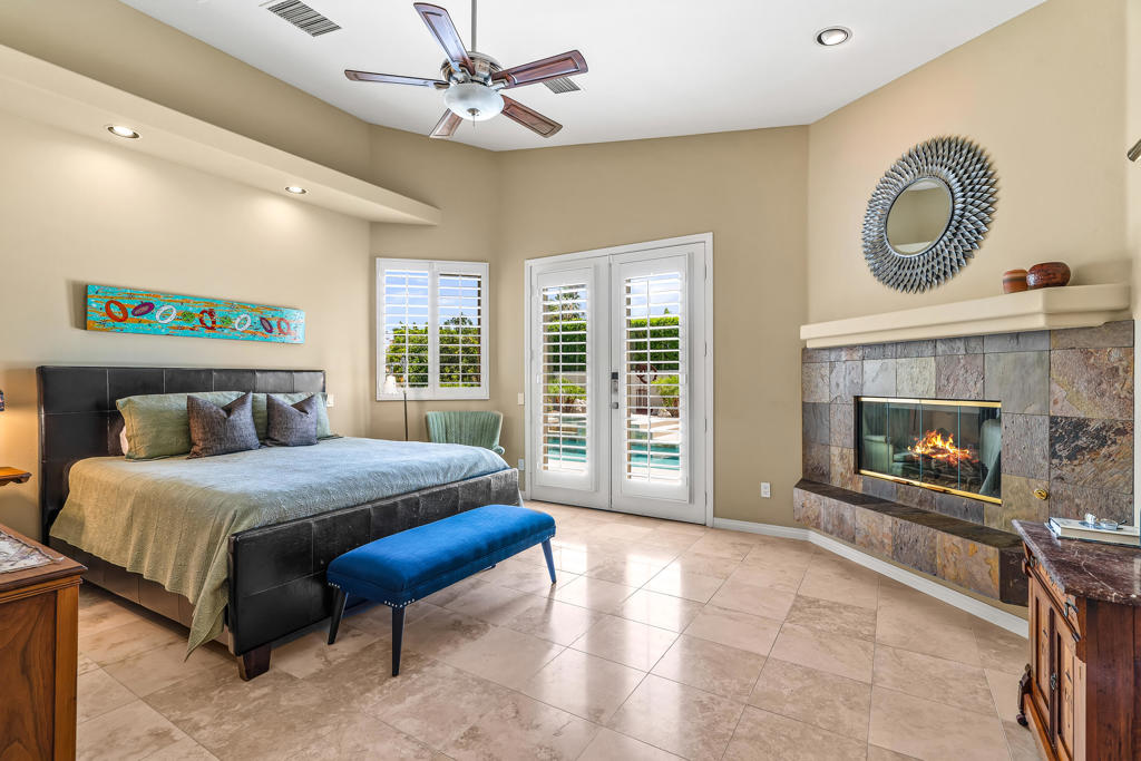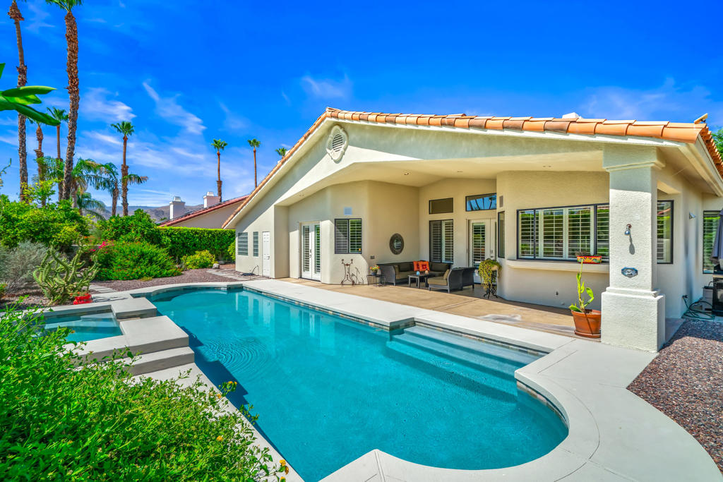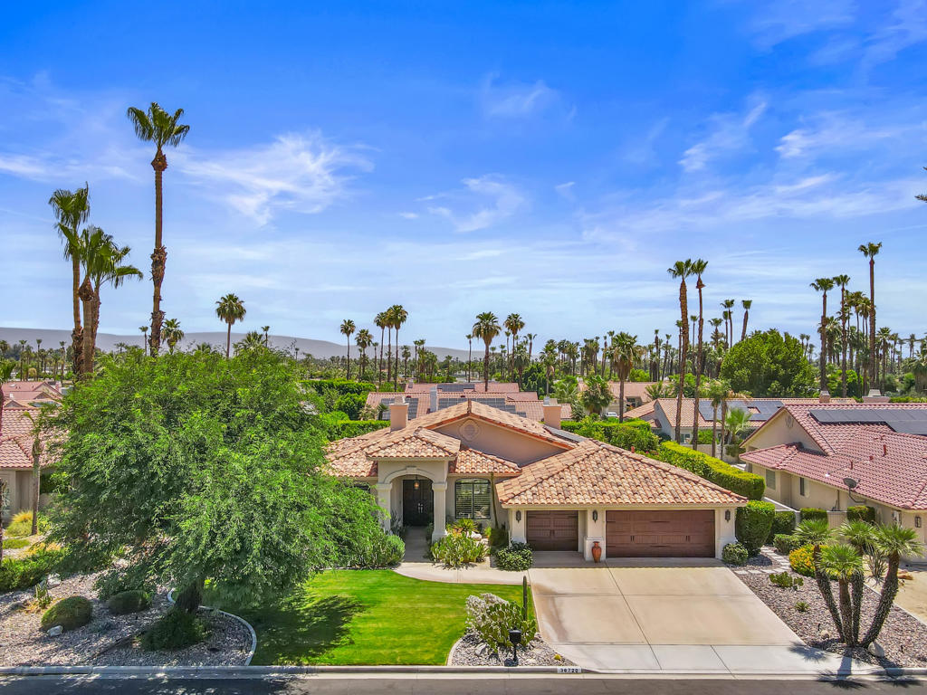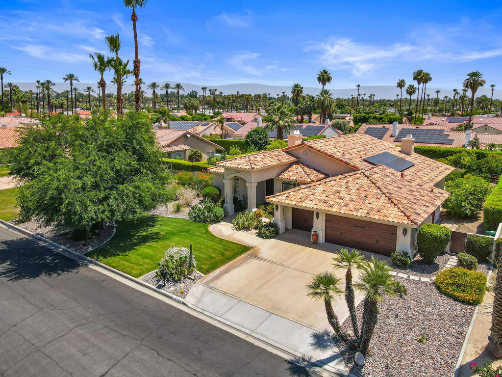 Discover unparalleled desert-style living in this exquisite Spanish traditional home in the prestigious Tamarisk area of Rancho Mirage. This residence combines timeless elegance and modern sophistication on a tranquil cul-de-sac with mountain views. Enter to find wonderful travertine flooring throughout, setting a grand yet welcoming tone. The home features a large primary retreat with fireplace as well as three additional bedrooms and two and a half baths all designed for owner and guest privacy. The chef's kitchen serves as the heart of the home, boasting granite countertops, ample cabinetry, and a cozy breakfast room with fireplace enhancing the space's charm. The formal large living and dining rooms, complete with vaulted ceilings, are ideal for stylish entertaining. The family room offers another inviting fireplace and step-down wet bar perfect for gatherings or relaxation. Outside, a private oasis awaits with covered patio and large backyard including a sparkling designer pebble pool with waterfall spa surrounded by mature landscaping. This outdoor sanctuary is ideal for lounging, al fresco dining or hosting friends and family. Owned solar panels ensure lower electric costs, while smart home technology allows remote control of lights and doors. The three-car garage offers ample storage and workspace, blending practicality with luxury. This isn't just a home ... it's a lifestyle. Every detail is crafted for an unparalleled living experience, where elegance, comfort, and technology merge into one stunning retreat all for an amazing price. Don't miss this opportunity.