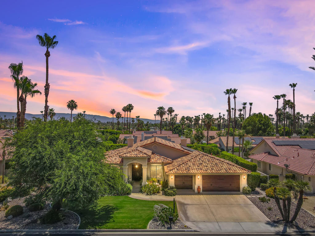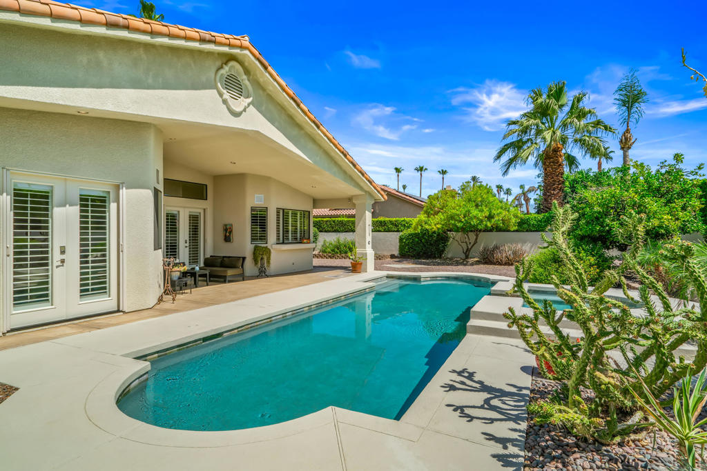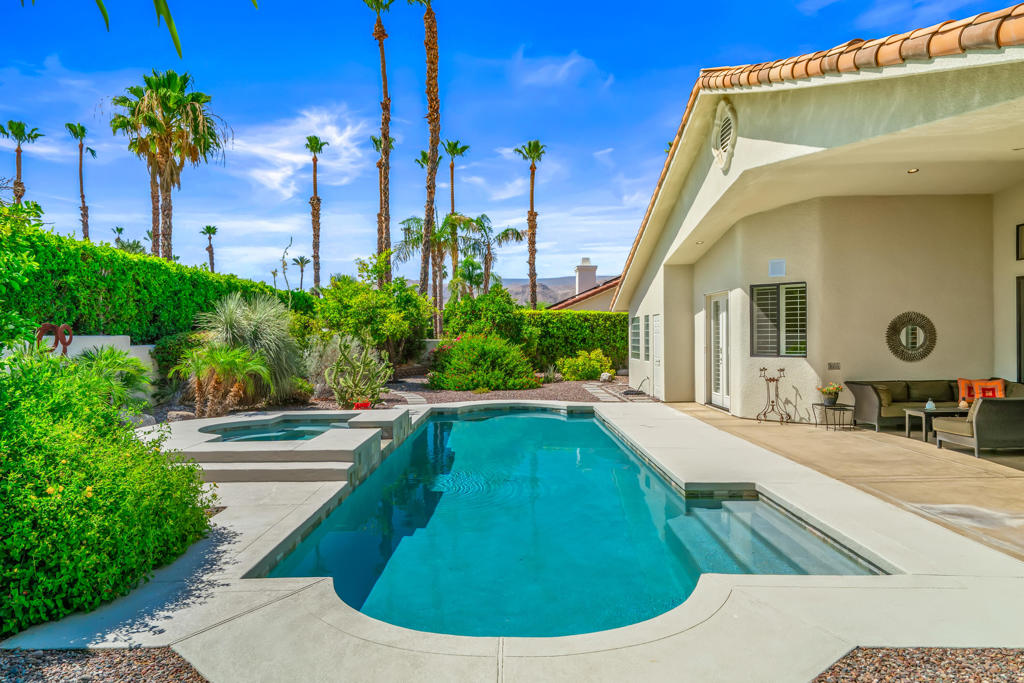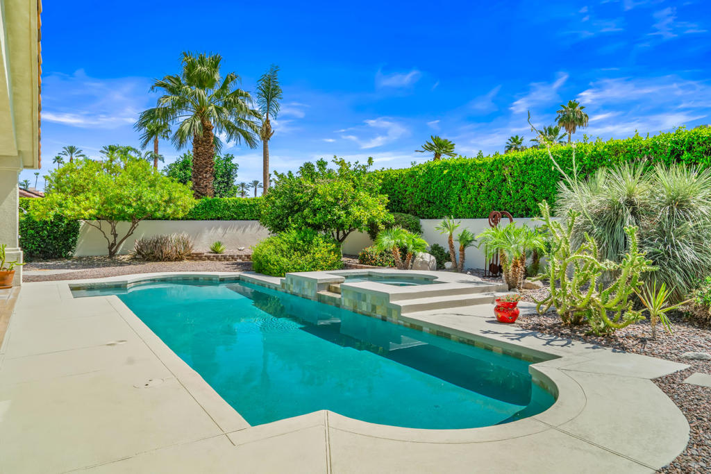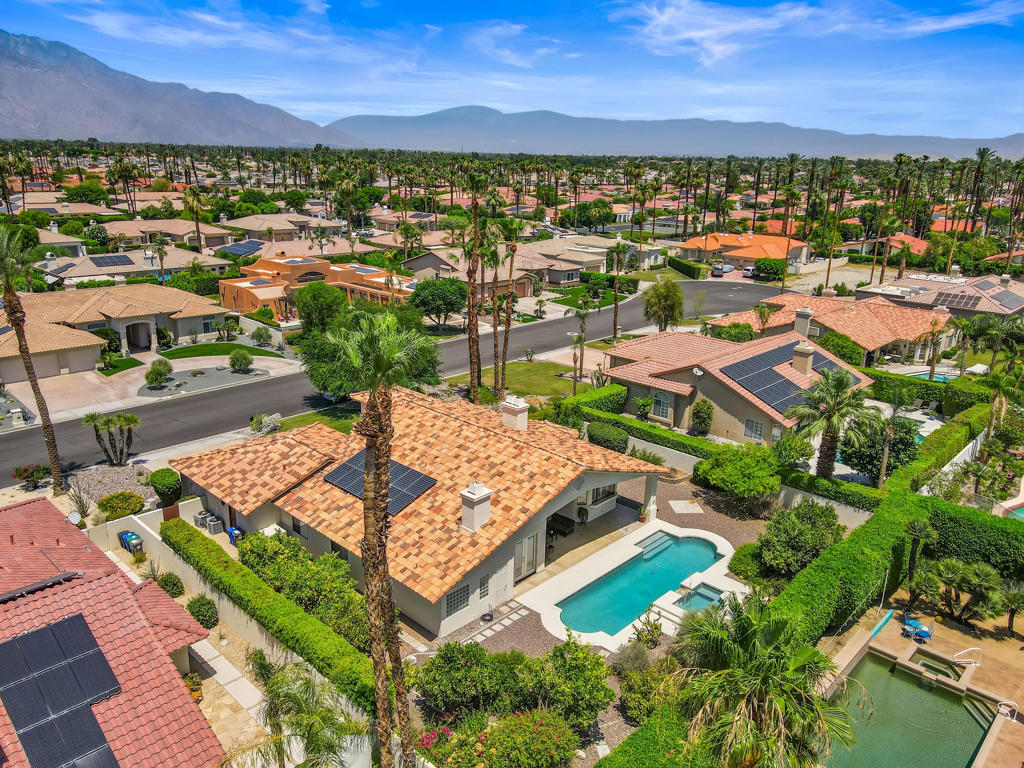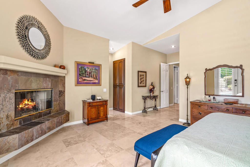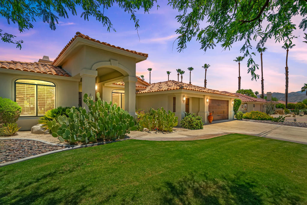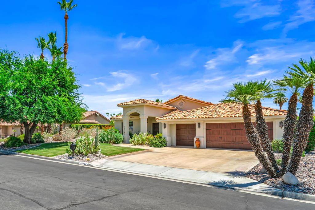 Discover unparalleled desert-style living in this exquisite Spanish traditional home in the prestigious Tamarisk area of Rancho Mirage. This residence combines timeless elegance and modern sophistication on a tranquil cul-de-sac with mountain views. Enter to find wonderful travertine flooring throughout, setting a grand yet welcoming tone. The home features a large primary retreat with fireplace as well as three additional bedrooms and two and a half baths all designed for owner and guest privacy. The chef's kitchen serves as the heart of the home, boasting granite countertops, ample cabinetry, and a cozy breakfast room with fireplace enhancing the space's charm. The formal large living and dining rooms, complete with vaulted ceilings, are ideal for stylish entertaining. The family room offers another inviting fireplace and step-down wet bar perfect for gatherings or relaxation. Outside, a private oasis awaits with covered patio and large backyard including a sparkling designer pebble pool with waterfall spa surrounded by mature landscaping. This outdoor sanctuary is ideal for lounging, al fresco dining or hosting friends and family. Owned solar panels ensure lower electric costs, while smart home technology allows remote control of lights and doors. The three-car garage offers ample storage and workspace, blending practicality with luxury. This isn't just a home ... it's a lifestyle. Every detail is crafted for an unparalleled living experience, where elegance, comfort, and technology merge into one stunning retreat all for an amazing price. Don't miss this opportunity.