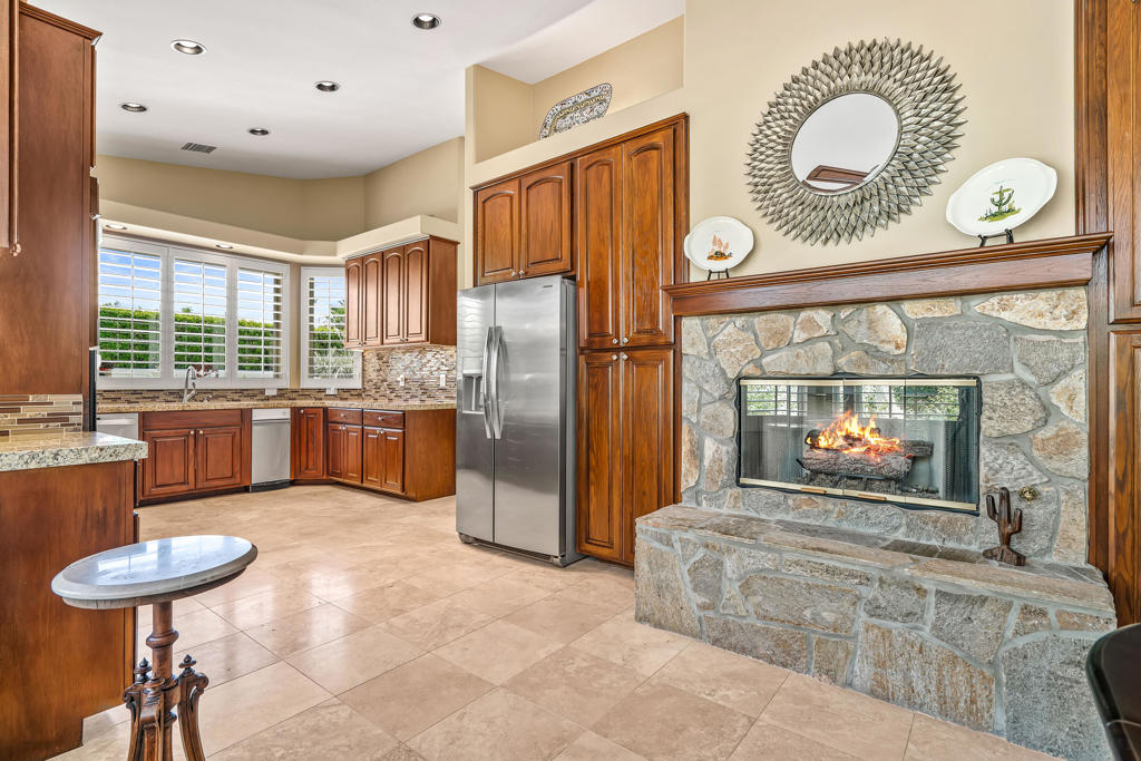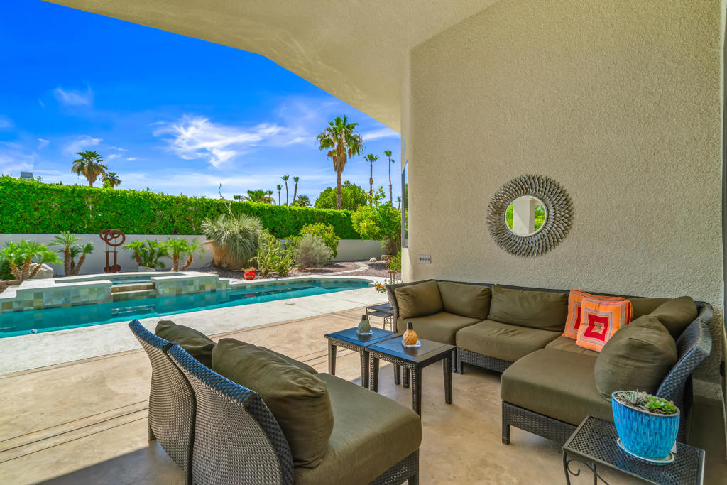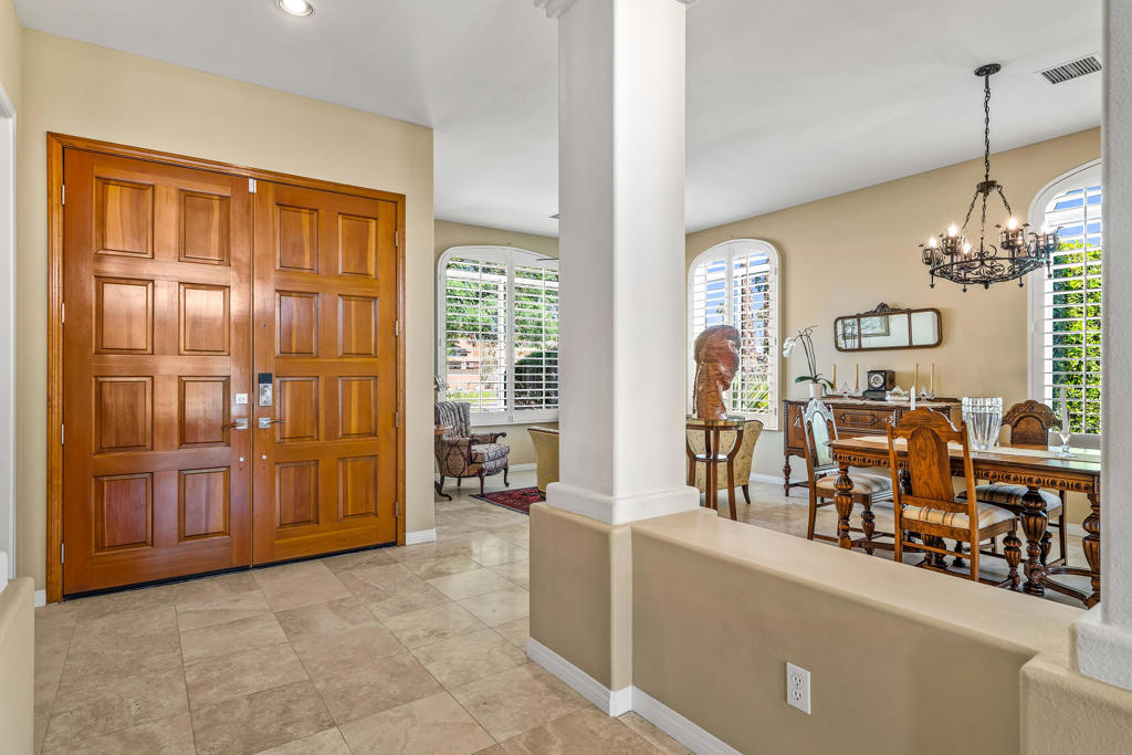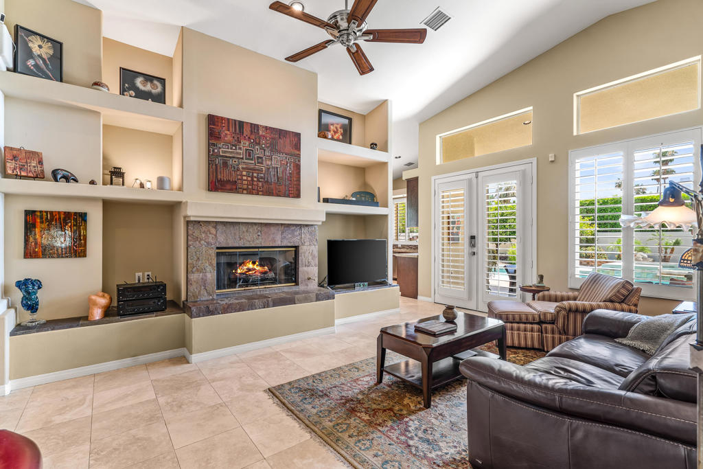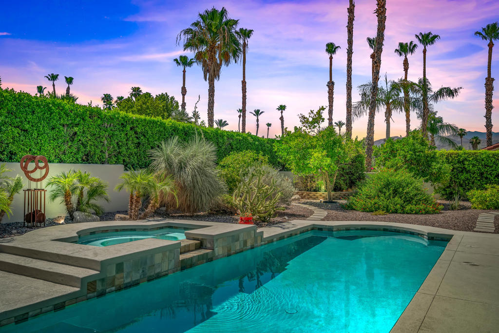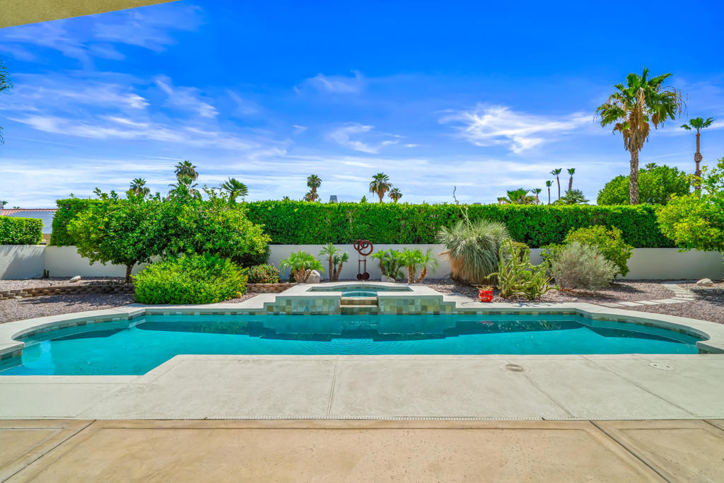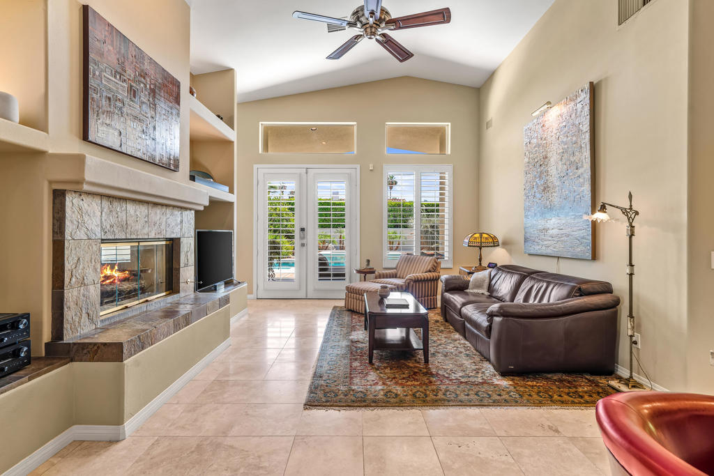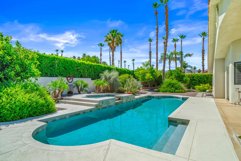 Discover unparalleled desert-style living in this exquisite Spanish traditional home in the prestigious Tamarisk area of Rancho Mirage. This residence combines timeless elegance and modern sophistication on a tranquil cul-de-sac with mountain views. Enter to find wonderful travertine flooring throughout, setting a grand yet welcoming tone. The home features a large primary retreat with fireplace as well as three additional bedrooms and two and a half baths all designed for owner and guest privacy. The chef's kitchen serves as the heart of the home, boasting granite countertops, ample cabinetry, and a cozy breakfast room with fireplace enhancing the space's charm. The formal large living and dining rooms, complete with vaulted ceilings, are ideal for stylish entertaining. The family room offers another inviting fireplace and step-down wet bar perfect for gatherings or relaxation. Outside, a private oasis awaits with covered patio and large backyard including a sparkling designer pebble pool with waterfall spa surrounded by mature landscaping. This outdoor sanctuary is ideal for lounging, al fresco dining or hosting friends and family. Owned solar panels ensure lower electric costs, while smart home technology allows remote control of lights and doors. The three-car garage offers ample storage and workspace, blending practicality with luxury. This isn't just a home ... it's a lifestyle. Every detail is crafted for an unparalleled living experience, where elegance, comfort, and technology merge into one stunning retreat all for an amazing price. Don't miss this opportunity.