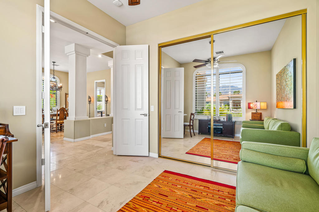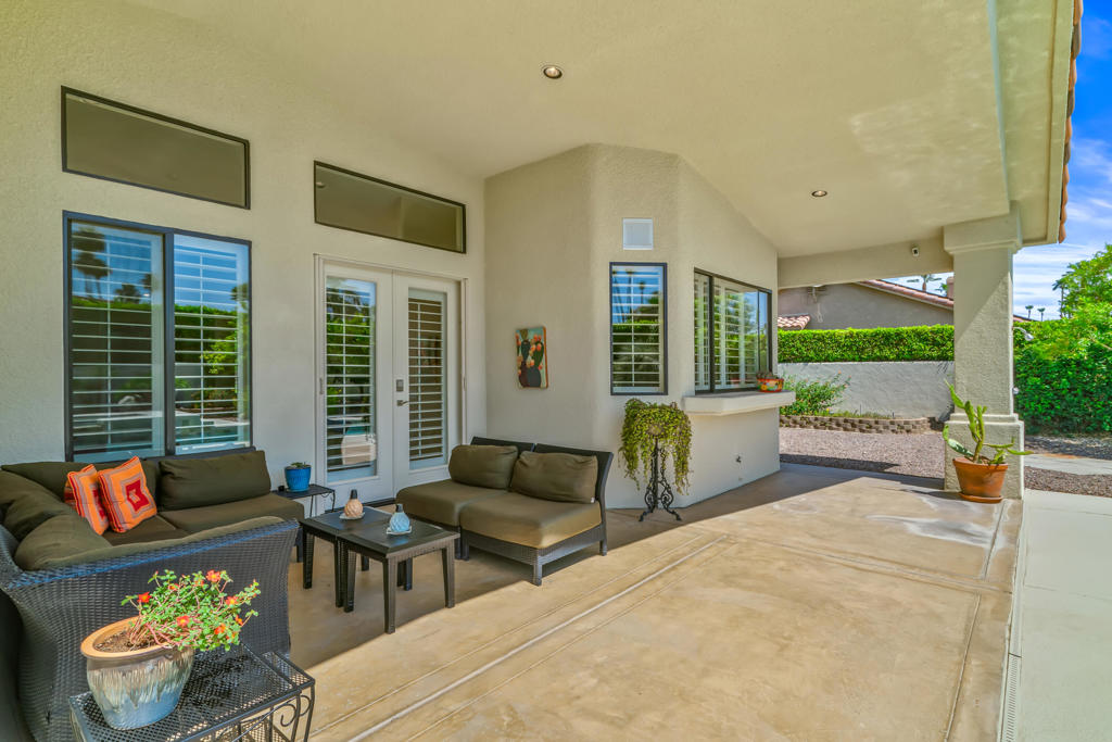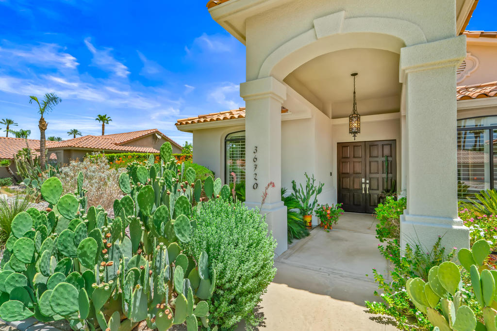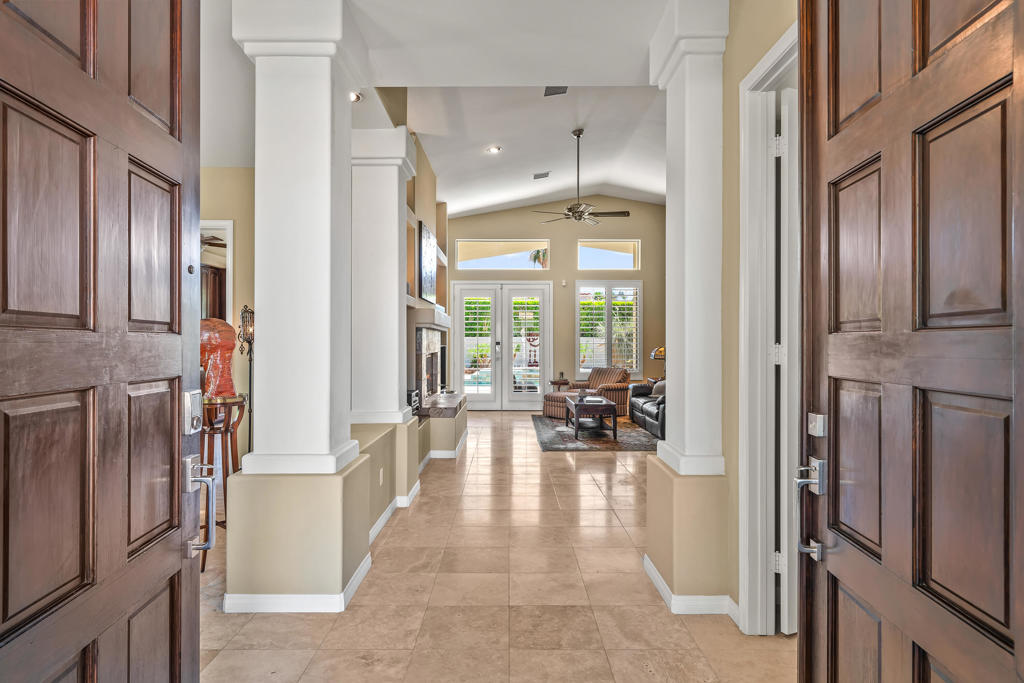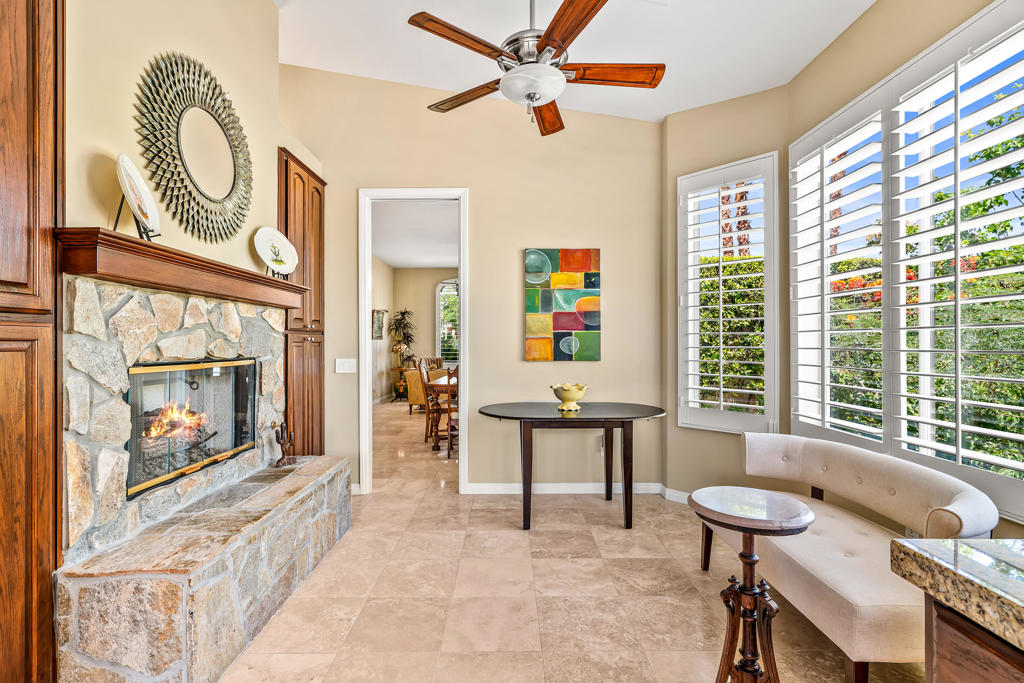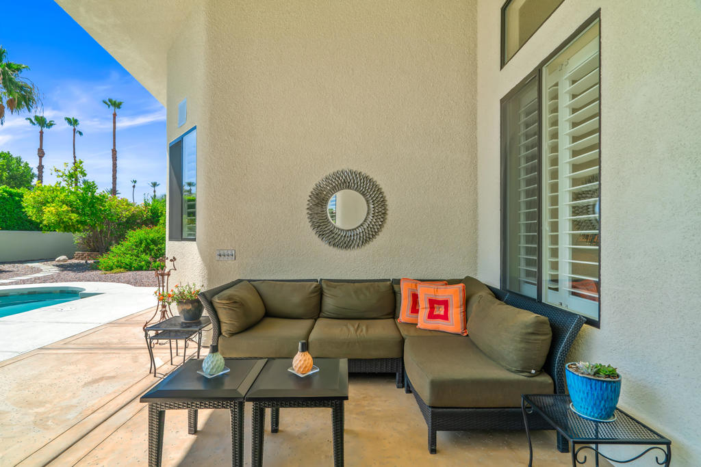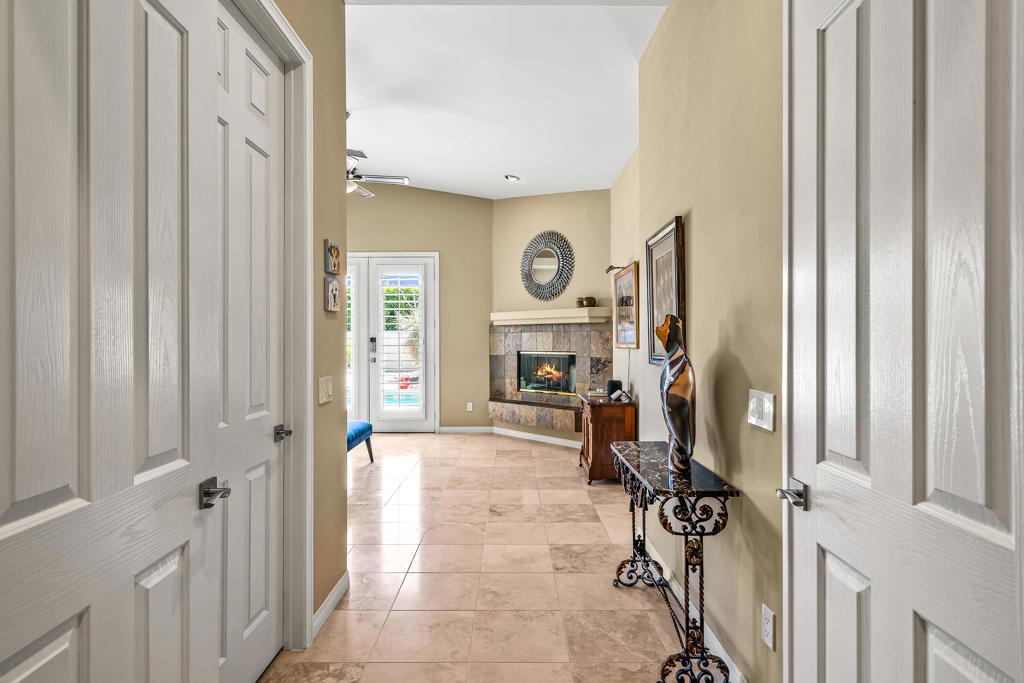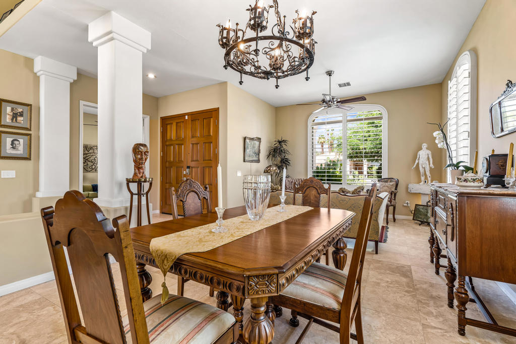 Discover unparalleled desert-style living in this exquisite Spanish traditional home in the prestigious Tamarisk area of Rancho Mirage. This residence combines timeless elegance and modern sophistication on a tranquil cul-de-sac with mountain views. Enter to find wonderful travertine flooring throughout, setting a grand yet welcoming tone. The home features a large primary retreat with fireplace as well as three additional bedrooms and two and a half baths all designed for owner and guest privacy. The chef's kitchen serves as the heart of the home, boasting granite countertops, ample cabinetry, and a cozy breakfast room with fireplace enhancing the space's charm. The formal large living and dining rooms, complete with vaulted ceilings, are ideal for stylish entertaining. The family room offers another inviting fireplace and step-down wet bar perfect for gatherings or relaxation. Outside, a private oasis awaits with covered patio and large backyard including a sparkling designer pebble pool with waterfall spa surrounded by mature landscaping. This outdoor sanctuary is ideal for lounging, al fresco dining or hosting friends and family. Owned solar panels ensure lower electric costs, while smart home technology allows remote control of lights and doors. The three-car garage offers ample storage and workspace, blending practicality with luxury. This isn't just a home ... it's a lifestyle. Every detail is crafted for an unparalleled living experience, where elegance, comfort, and technology merge into one stunning retreat all for an amazing price. Don't miss this opportunity.