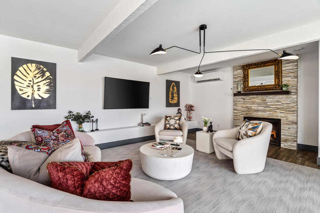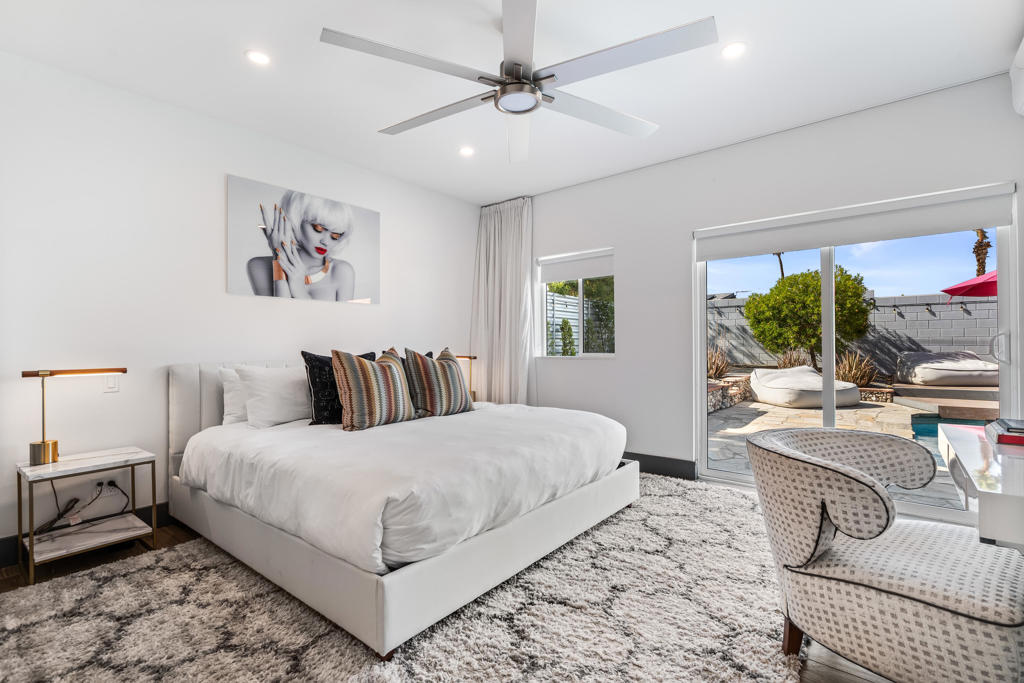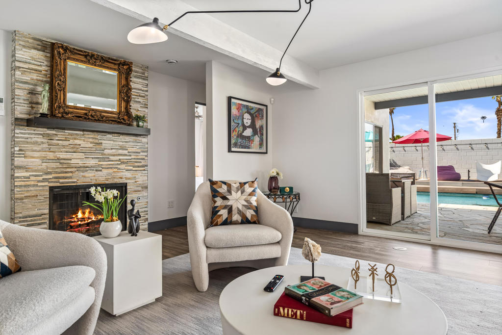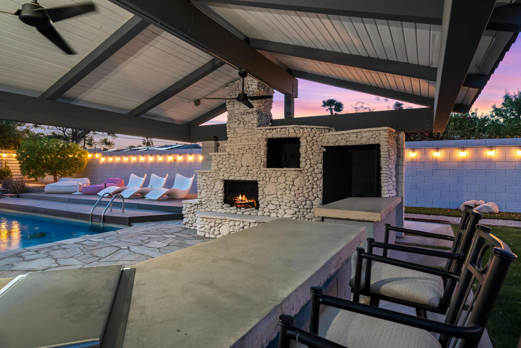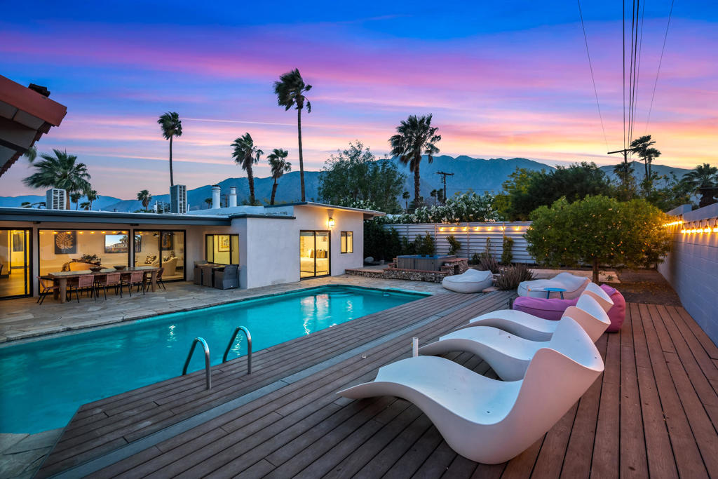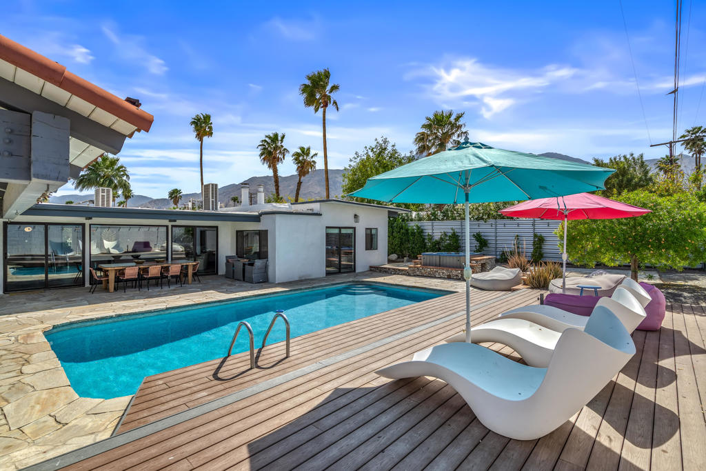 Just waiting for you is the ultimate Palm Springs retreat nestled in the much sought-after Racquet Club Estates. This newly revitalized Post and Beam masterpiece, originally built in 1959, blends iconic midcentury modern design with contemporary luxury. The home has undergone extensive renovations, transforming it into a modern sanctuary. Boasting four bedrooms and three bathrooms, including two lavish primary ensuites, this residence offers the perfect blend of style and comfort. The refreshed interiors feature updated designer lighting and expansive energy efficient windows, enhanced by updated electrical systems, state-of-the-art HVAC systems, and newer drywall and paint creating a residence that is move in ready. The open kitchen, the heart of this home, offers ample storage and counter space, seamlessly connecting to the living and dining areas creating the ideal flow for both everyday living and hosting. Step outside to the ultimate entertaining haven--a chic outdoor living pavilion complete with a fireplace, sleek barbecue, and large bar. Host unforgettable gatherings or just unwind under the desert sky, taking in breathtaking mountain views by the sparkling tiled pool or in the jetted spa. Stay active on the sprawling lawn perfect for croquet, bocce ball, or yoga. With a covered patio and raised sun deck, the outdoor possibilities are endless. This isn't just a home--it's a lifestyle! Whether you're seeking a sophisticated full-time residence, a chic weekend retreat, or a lucrative rental investment, this turnkey furnished property has it all. Don't miss this chance to claim your dream Palm Springs home--act swiftly and start living the lifestyle you've always envisioned!